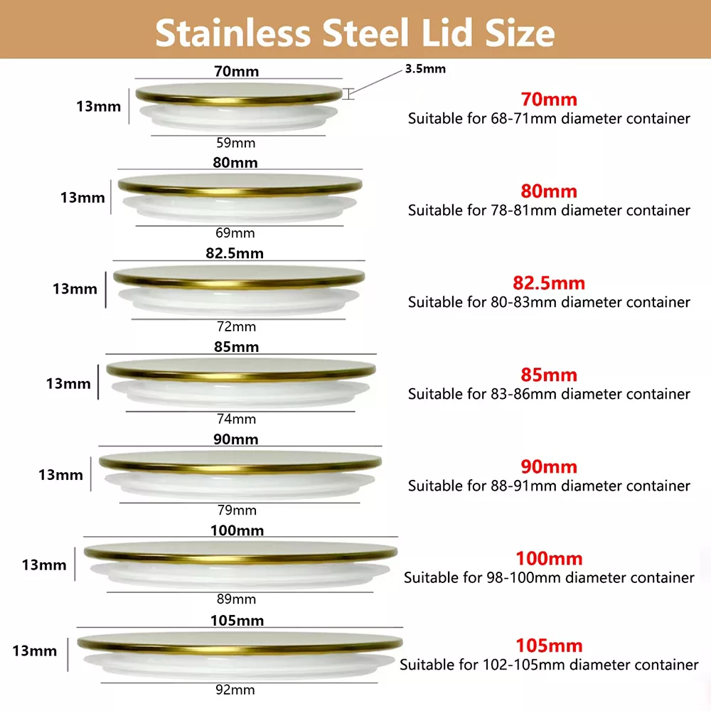 Những nắp lọ nến bằng thép không gỉ này được thiết kế để phù hợp với hầu hết các lỗ nến phổ biến. Họ không chỉ niêm phong một cách hiệu quả bình và khóa trong nước hoa, mà còn ngay lập tức tăng cường cảm giác phong cách và cá nhân hóa của bao bì tổng thể. Cho dù được sử dụng trong môi trường gia đình (chẳng hạn như trang trí phòng khách của bạn và khuếch tán mùi hương yêu thích của bạn) hoặc được kết hợp thành một bộ quà tặng có thương hiệu đẹp mắt, họ kết hợp thành công thực tế cốt lõi, tính bền vững tích cực và biểu hiện cá nhân, thân thiện với giới trẻ.