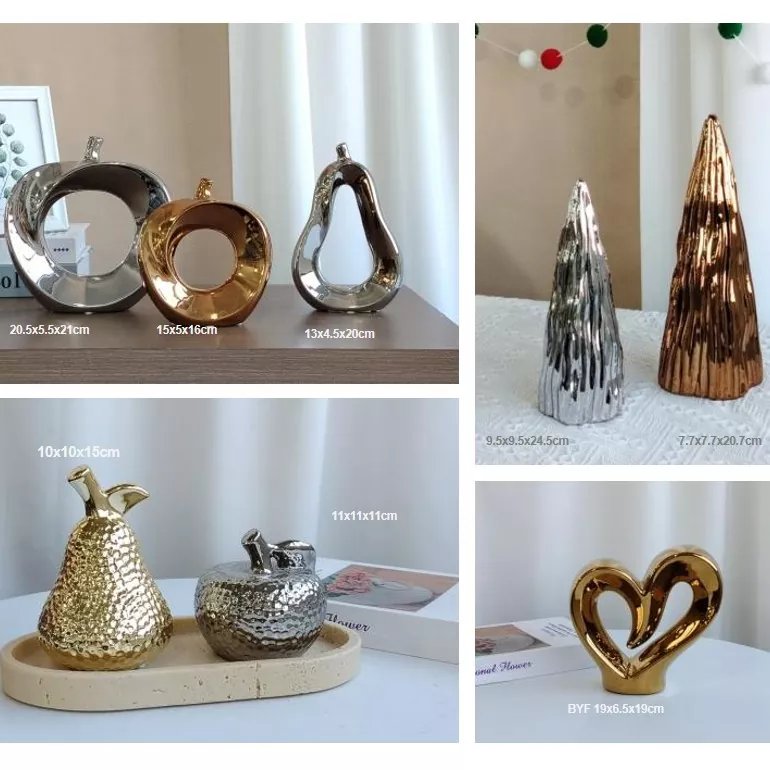 Các kiểu dáng gốm đặc biệt của BYF có trái cây, cây Giáng sinh và trái tim. Được làm bằng gốm, họ sử dụng một kỹ thuật độc đáo để tạo ra một ánh kim loại, có sẵn bằng vàng và bạc. Các thiết kế trái cây (táo và lê) có các đường mịn, với các đường cắt và kết cấu độc đáo; Cây Giáng sinh là ba chiều, với kết cấu phong phú; Và trái tim đơn giản và thanh lịch, cho vay một chút lãng mạn. Những tác phẩm thanh lịch, sang trọng này là hoàn hảo cho phòng khách hoặc bàn của bạn, thêm một chút tinh tế nghệ thuật và phong cách cho ngôi nhà của bạn. Chúng là các phụ kiện tinh tế giúp tăng cường không gian của bất kỳ không gian nào.